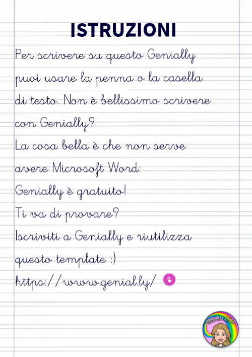 Per scrivere su questo Genially puoi usare la penna o la caselladi testo. Non è bellissimo scriverecon Genially?La cosa bella è che non serveavere Microsoft Word:Genially è gratuito! Ti va di provare?Iscriviti a Genially e riutilizza questo template :)https://www.genial.ly/